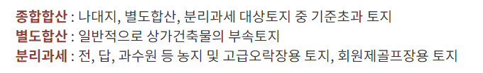 토지에 대한 과세대상은 주택부속토지를 제외한 모든 토지를 종합합산, 별도합산, 분리과세로 구분합니다.