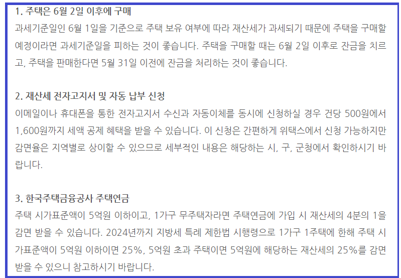 재산세를 절약하는 방법 중 하나는 세율이 낮은 시기에 매매를 고려하는 것입니다.