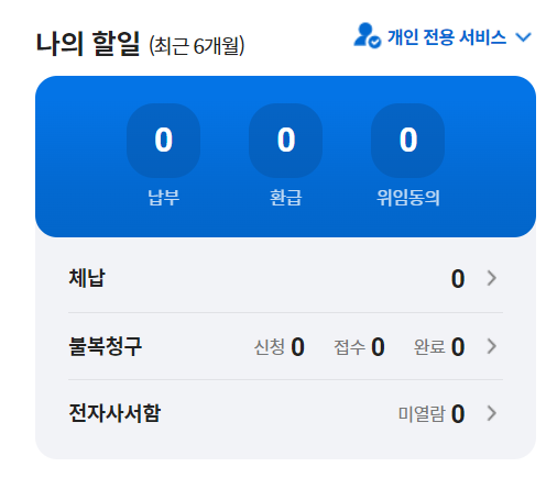 - 우측 화면에서 '나의 할 일'에 납부할 재산세가 있을 경우 숫자가 표시되며, 클릭을 통해 납부할 수 있습니다.