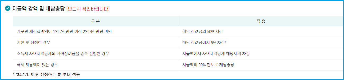 만약 재산 합계가 1억 7천만 원 이상, 2억 4천만 원 미만일 경우, 지급 금액이 50% 차감됩니다.