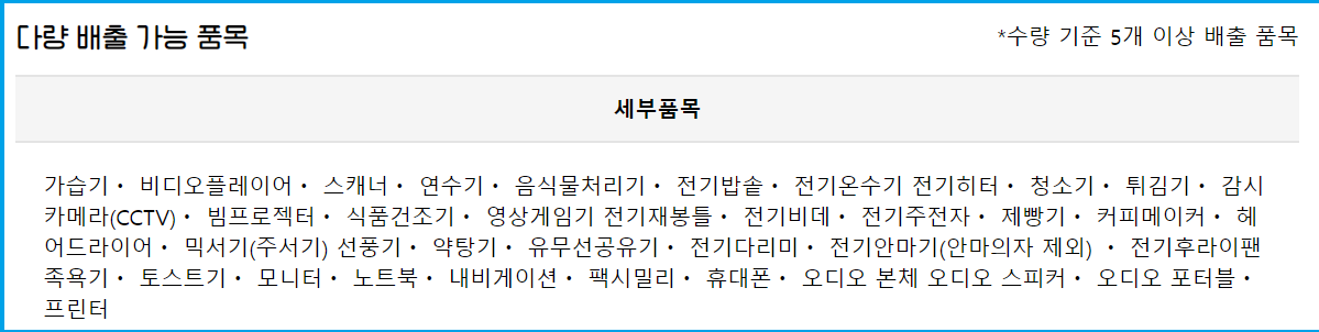 - 소형 폐가전제품(5개 이상 동시 배출 시) : 가습기, 전기밥솥, 전기히터, 청소기, 선풍기, 노트북 등