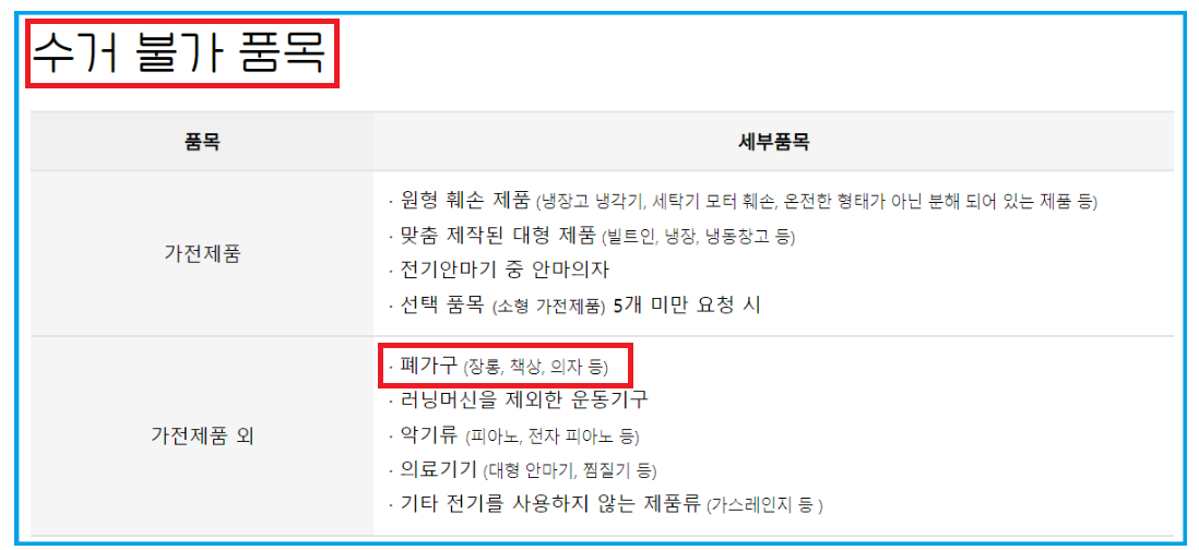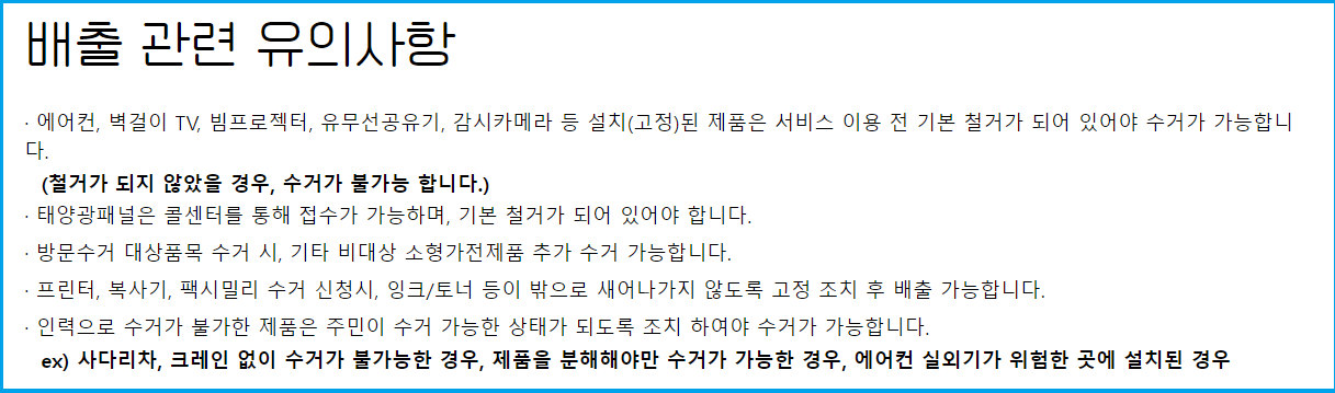 일부 품목은 수거가 불가능할 수 있으니, 다음 품목은 무료수거 서비스 대상에서 제외됩니다.