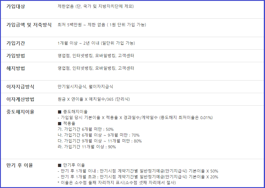 가입금액은 최저 5백만 원 ~ 제한이 없고, 가입기간은 1개월 이상 ~ 2년 이내입니다.