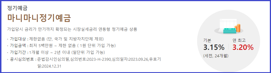 가입금액은 고객당 1백만 원 ~ 5억 원 이하이고, 가입기간은 6개월, 12개월, 24개월입니다.