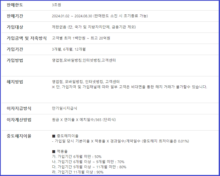 가입금액은 1백만 원 ~ 10억 원 이하이고, 가입기간은 3개월, 6개월, 12개월입니다.