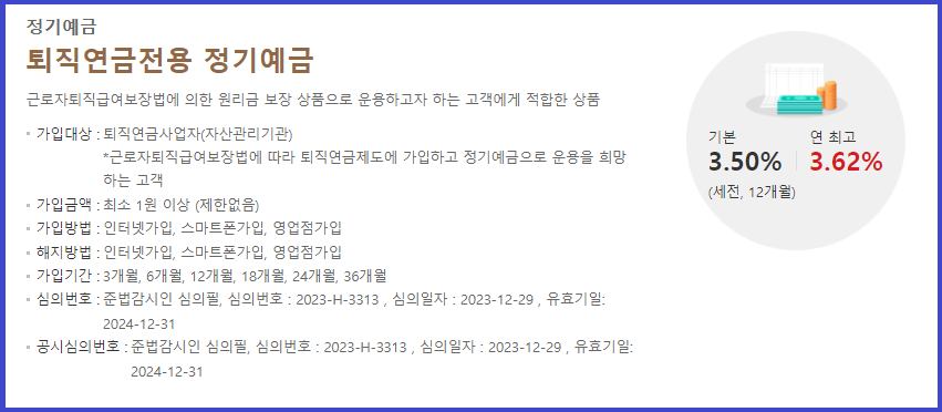 √ 퇴직연금전용 정기예금 금리는 연 최고 3.62%이며,