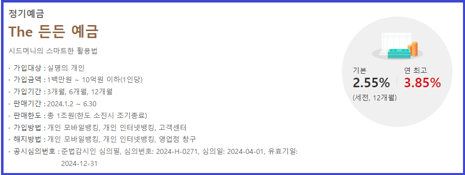 √ The 든든 예금 금리는 최고 연 3.85%이며,