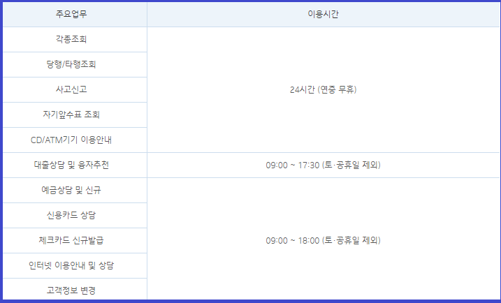 다만, 주말 또는 휴일의 경우 인터넷, 자동화코너, 고객센터를 통하여 은행 업무를 처리할 수