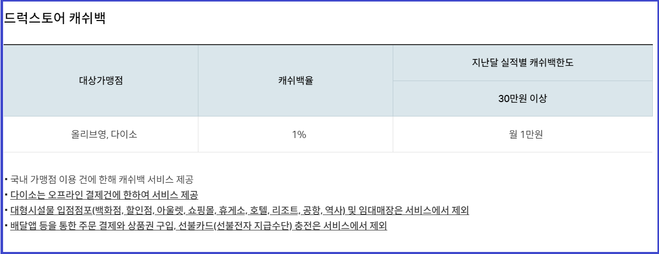 - 올리브영, 다이소 캐쉬백율(1%), 지난달 실적별 캐쉬백한도 30만원 이상 (월 1만원)