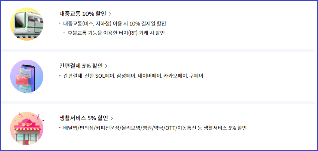 - 배달앱 / 편의점 / 커피전문점 / 올리브영 / 병원 / 약국 / OTT / 이동통신 등 생활서비스 5% 할인