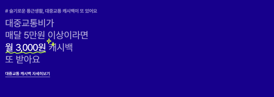 - 버스/지하철 10% 캐시백, 렌터카/카쉐어링/전기차 충전 5% 캐시백