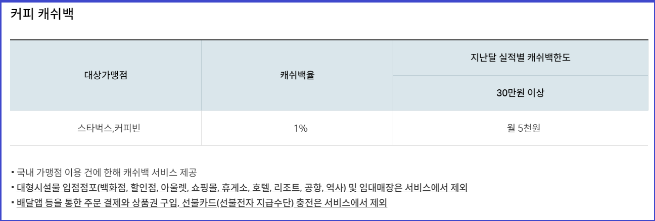 - 스타벅스, 커피빈 캐쉬백율(1%), 지난달 실적별 캐쉬백한도 30만원 이상 (월 5천원)
