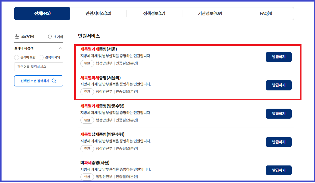 2. 세목별 과세증명서 발급하기를 클릭합니다. (서울 / 서울외)
