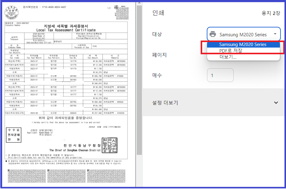 7. 세목별 과세증명서가 화면에 나오면 출력 또는 PDF 파일로 저장하시면 됩니다.