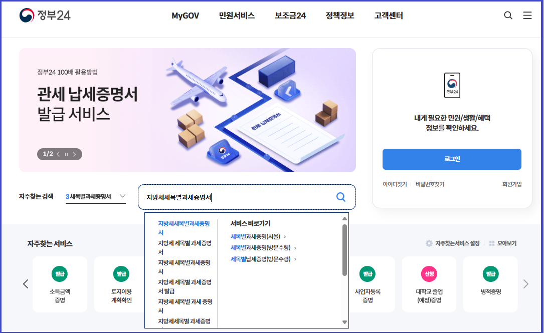 지금까지 지방세 세목별 과세증명서 읍면동 주민센터 발급 방법, 인터넷발급(정부 24),
