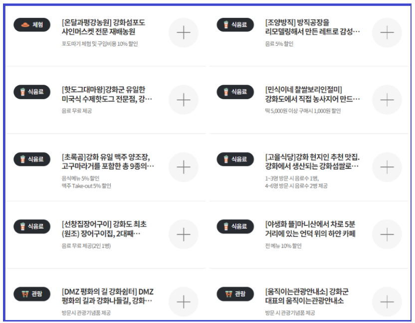 (숙박할인, 레스토랑 할인, 관광지 할인, 식음료 할인, 체험 할인 등)을