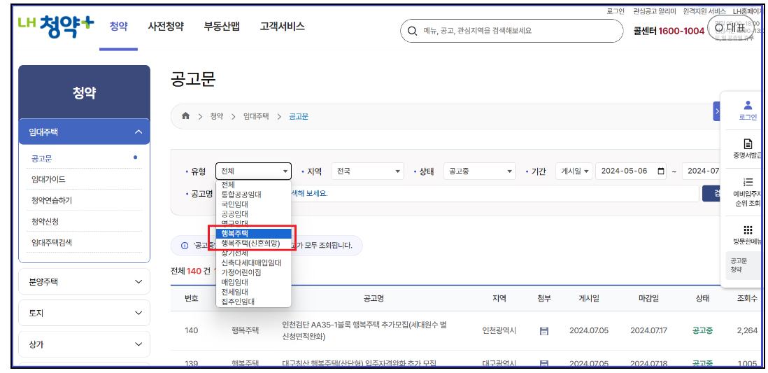 3. 공고문에서 유형을 행복주택 또는 행복주택 (신혼희망)을 선택합니다.