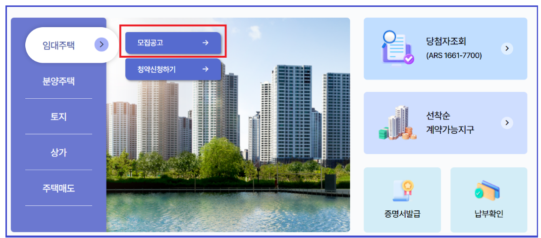 2. 청약 → 임대주택 → 모집공고를 클릭합니다.