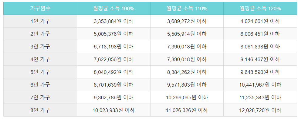 · (소득) 본인 · 부모 합계 소득이 전년도 도시 근로자 가구원수별 가구당 월평균소득의 120% 이하
