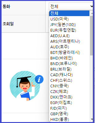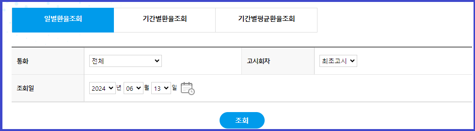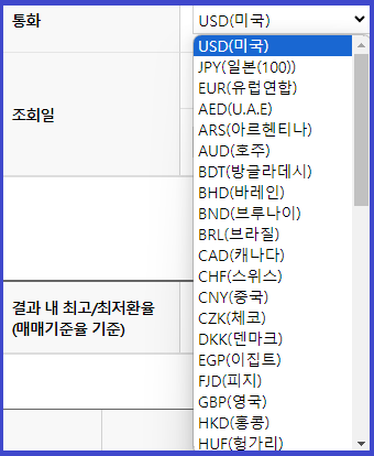 통화를 선택한 후, 일자를 선택하시고 조회하시면 됩니다.
