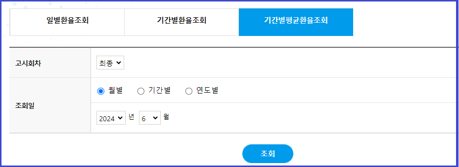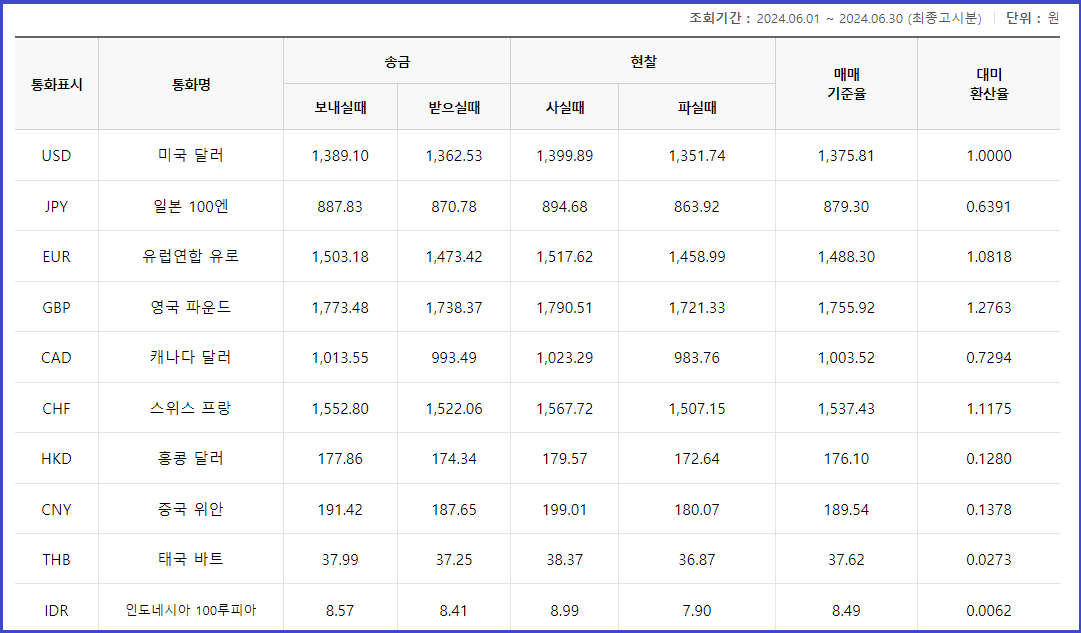 2. 조회기간 (2024.6.1 ~ 6.30) 동안 평균 환율이 조회됩니다.