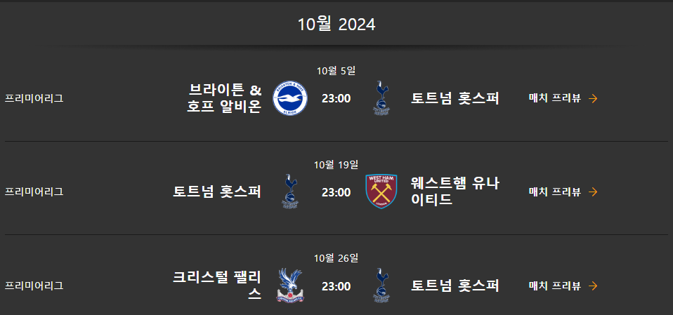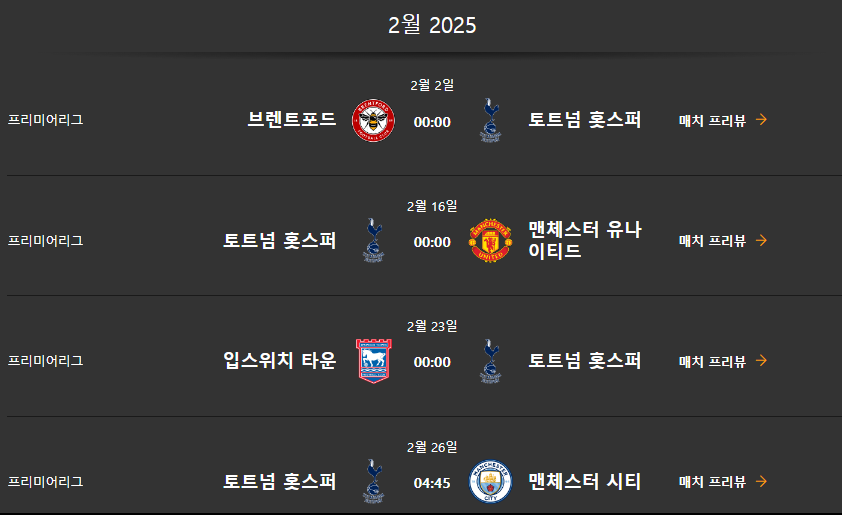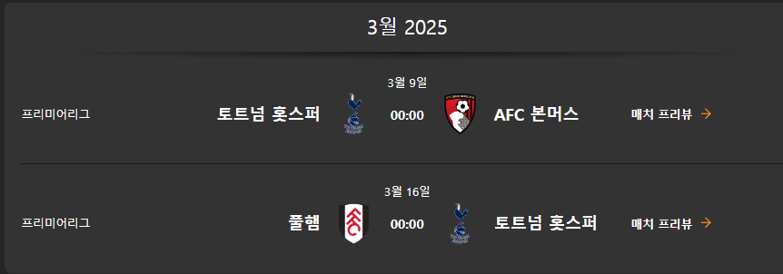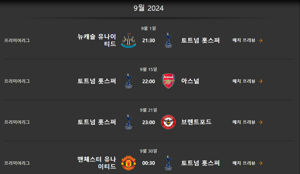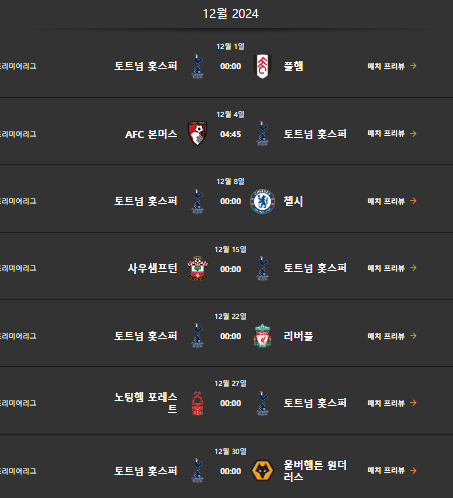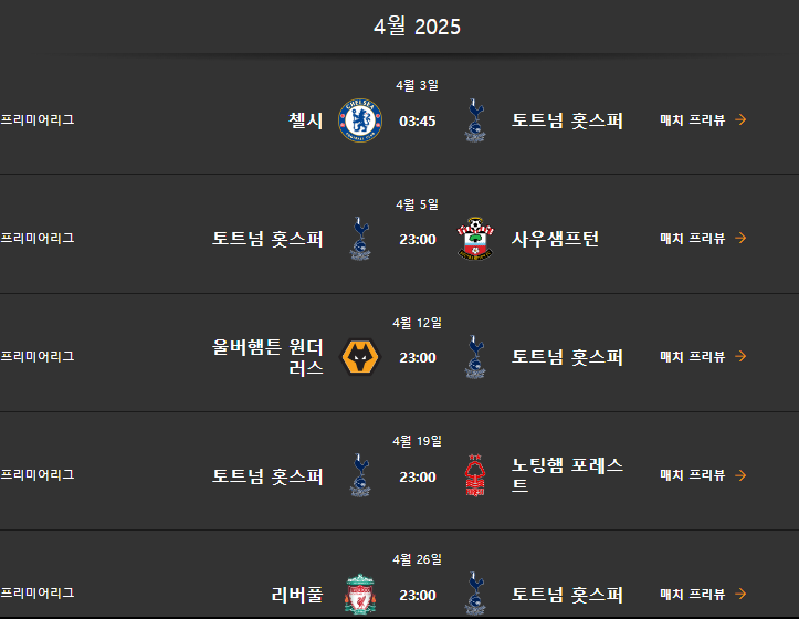 토트넘 경기일정 (2024년 7월 ~ 2025년 5월)은 다음과 같습니다.